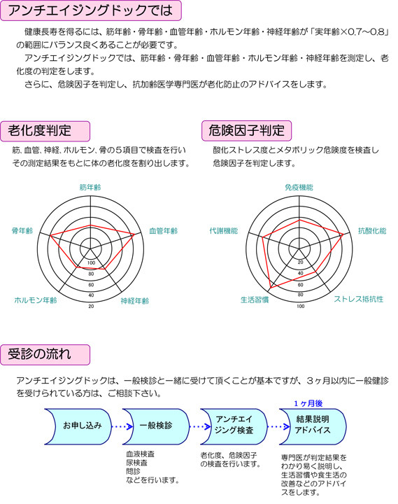 アンチエイジングドックは、病気になる前から自分の体の弱点や老化度を判断し、予防方法を提案するための検査です。
